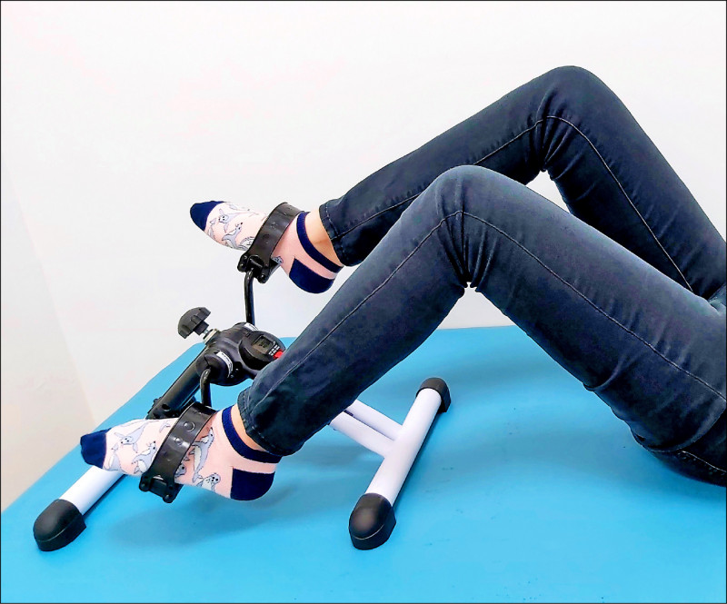 ●下肢肌力訓練:雙腳踩床上型腳踏車(圖4),從零阻力3分鐘、漸進阻力5至10分鐘、休息1分鐘,在可耐受下,重複實行漸進增加訓練時間,以達持續性之運動30分鐘,最後阻力漸減至零阻力5分鐘。